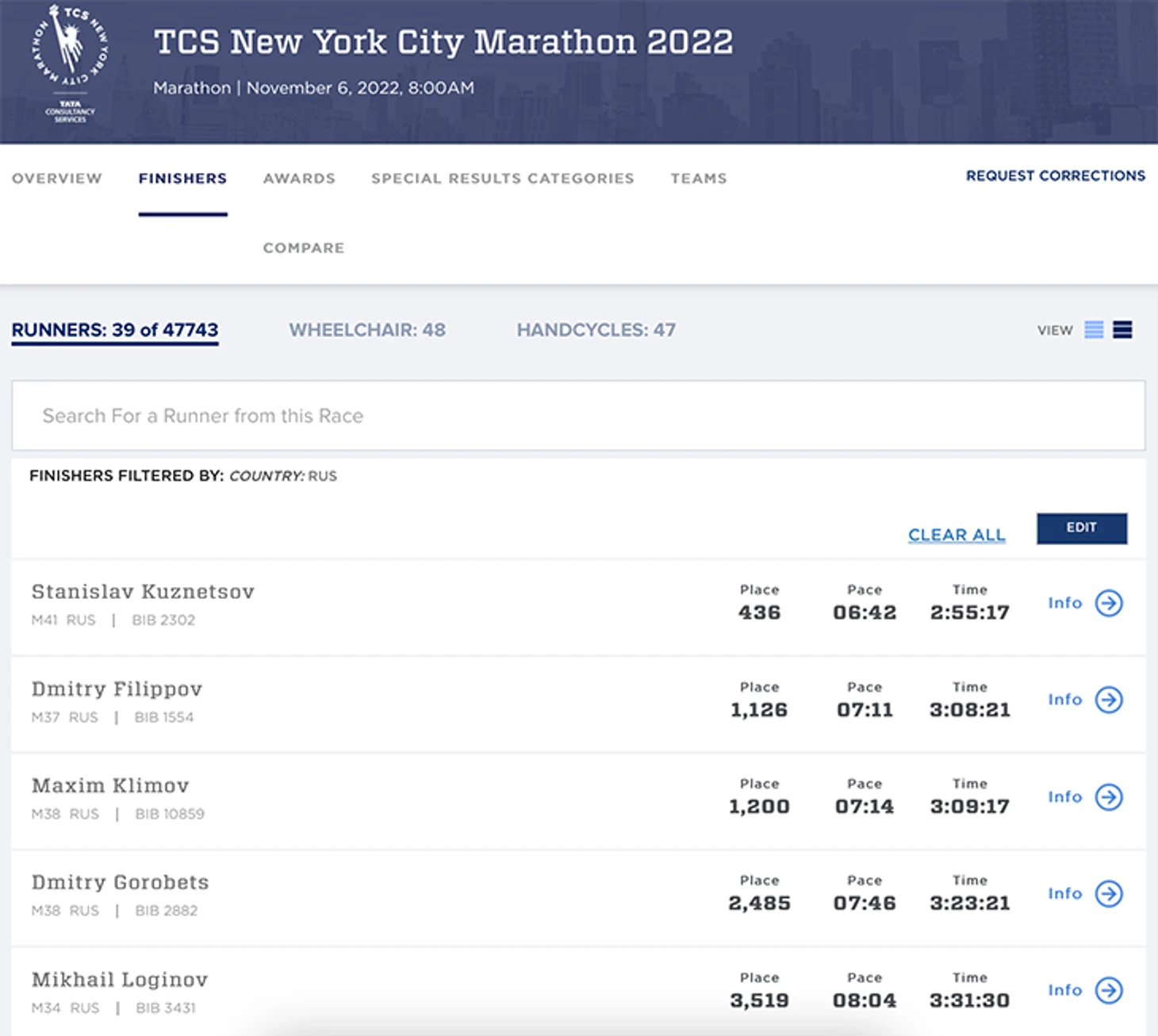 Кстати, в отличие от марафонов в Бостоне и Чикаго, Нью-Йорк не банил россиян и белорусов: 39 наших бегунов-любителей закончили дистанцию, даже с названием страны в протоколе напротив своих фамилий.