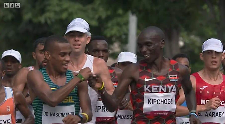 В 2021-м в Саппоро (там проходил олимпийский марафон) он тоже держался в лидерах – правда, без отрыва. Но бежал плечо к плечу с величайшим бегуном современности Элиудом Кипчоге. И делал это настолько без напряжения, что даже заговорил с ним и стукнулся кулаками. Это фото стало вирусным.