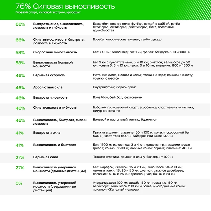 Ни один генетический тест с точностью до 100% не скажет, какой спорт вам следует выбрать. Спортивный успех, к счастью, лишь отчасти зависит от комбинации генов. Значение будут иметь место рождения и жительства, тренировки, окружение, стиль жизни, пр. Более того, большинство видов спорта сочетают, как правило, сразу несколько типов нагрузок, которые требуют включения разных генов.
