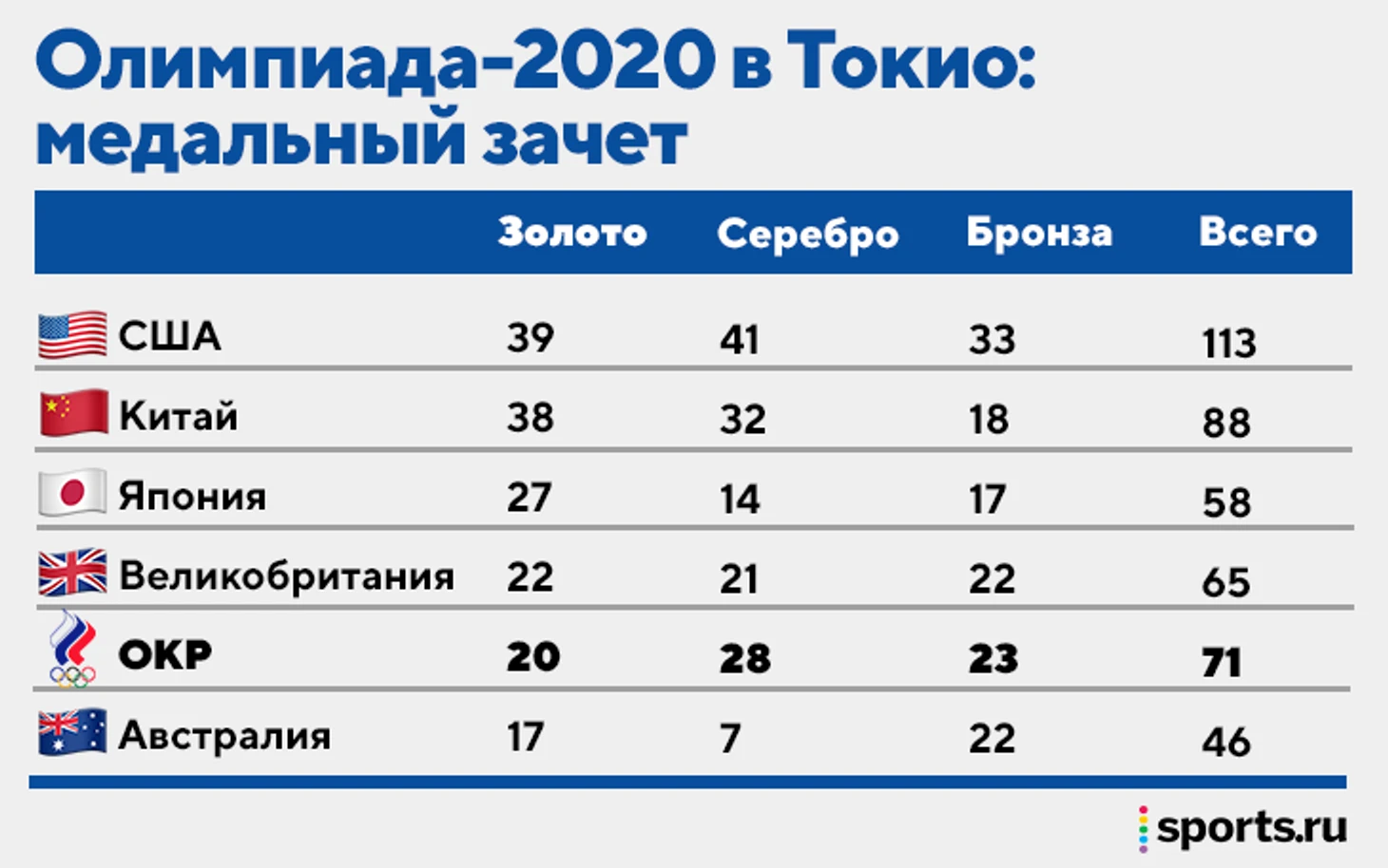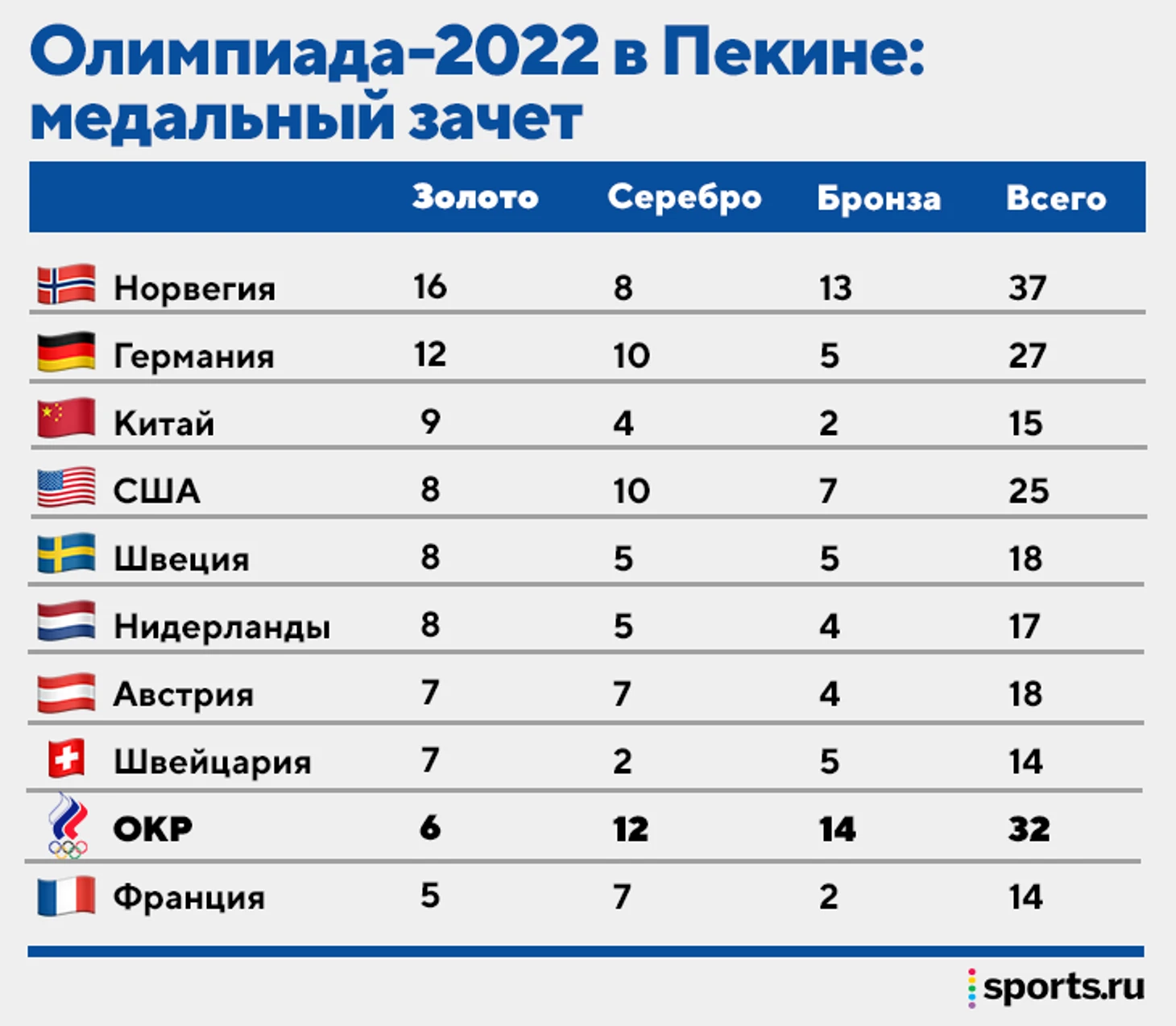 Вот медальная таблица с зимних Игр в Пекине. И здесь, кстати, учтена подвисшая пока еще медаль с командного турнира по фигурному катанию.