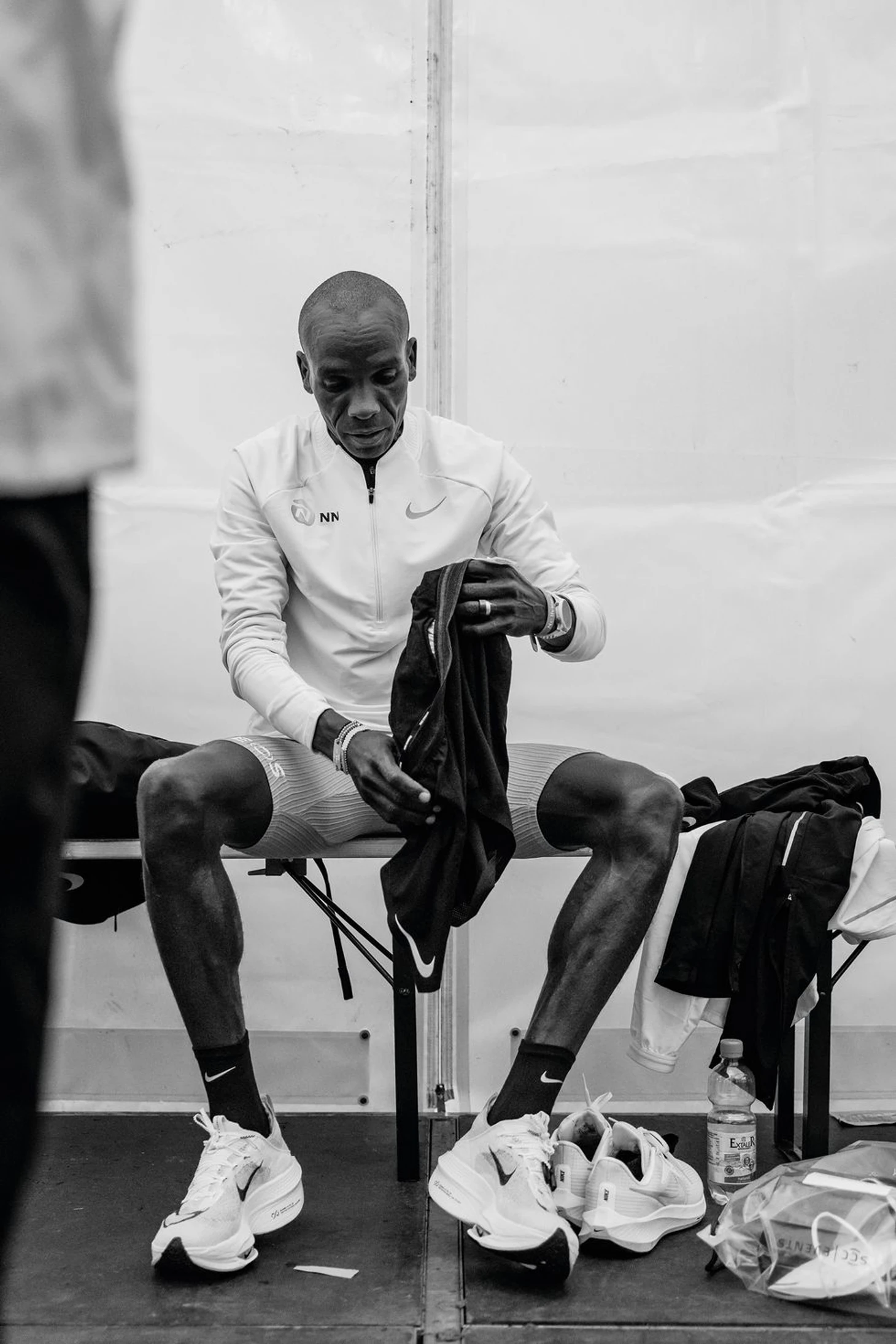 За два года, предшествовавших этому моменту, новые кроссовки «Nike» «Vaporfly» – в то время уникальные своей толстой и упругой межподошвой из пеноматериала «Pebax» и пластиной из углеродного волокна – перевернули с ног на голову принцип «меньше значит лучше», часто оказываясь на ногах победителей и лидеров многих марафоном мирового уровня. Через месяц после первых загадочных фотографий, Кипчоге в «VaporFly» установил мировой рекорд в марафоне, пробежав его за 2:01:39 в Берлине 2018.