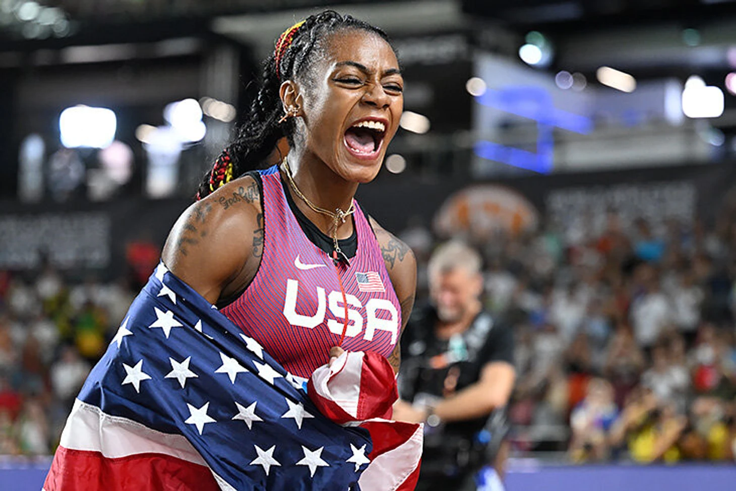А это 2023-й – и она только что выиграла 100-метровку чемпионата мира с рекордом турнира (10,65).