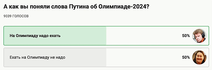 Интересно, что пользователи Sports.ru, в отличие от Матыцина, четкую позицию Владимира Путина про поездку на Олимпиаду не уловили. В нашем опросе мнения разделились ровно пополам.