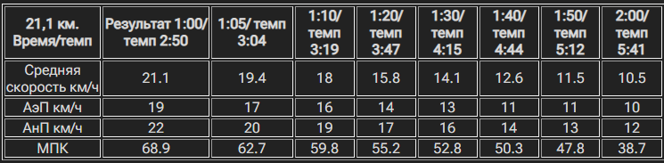 Для примера в таблице ниже приведены усредненные модельные характеристики спортсмена-бегуна в зависимости от результатов в полумарафоне. Важно, что это усредненные данные, кто-то пробежит на указанный результат и с показателями ниже / выше указанных в таблице в силу различных причин.
