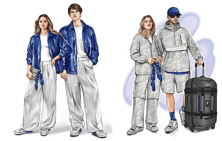 Для церемонии открытия приготовили костюмы из ярко-синей куртки и серых брюк. В комплект должно было войти около 60 вещей: серый костюм для медальных церемоний, ветрозащитный костюм из водоотталкивающей ткани с принтом, который «символически описывает мир», а также свитшоты, шорты, брюки, футболки, бейсболки, рюкзаки, полотенца.