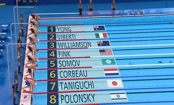 Пока что этот флаг не поднимали ни на какой церемонии, поэтому видим его только в графике трансляций. Первым из делегации в Париже соревновался пловец Евгений Сомов: