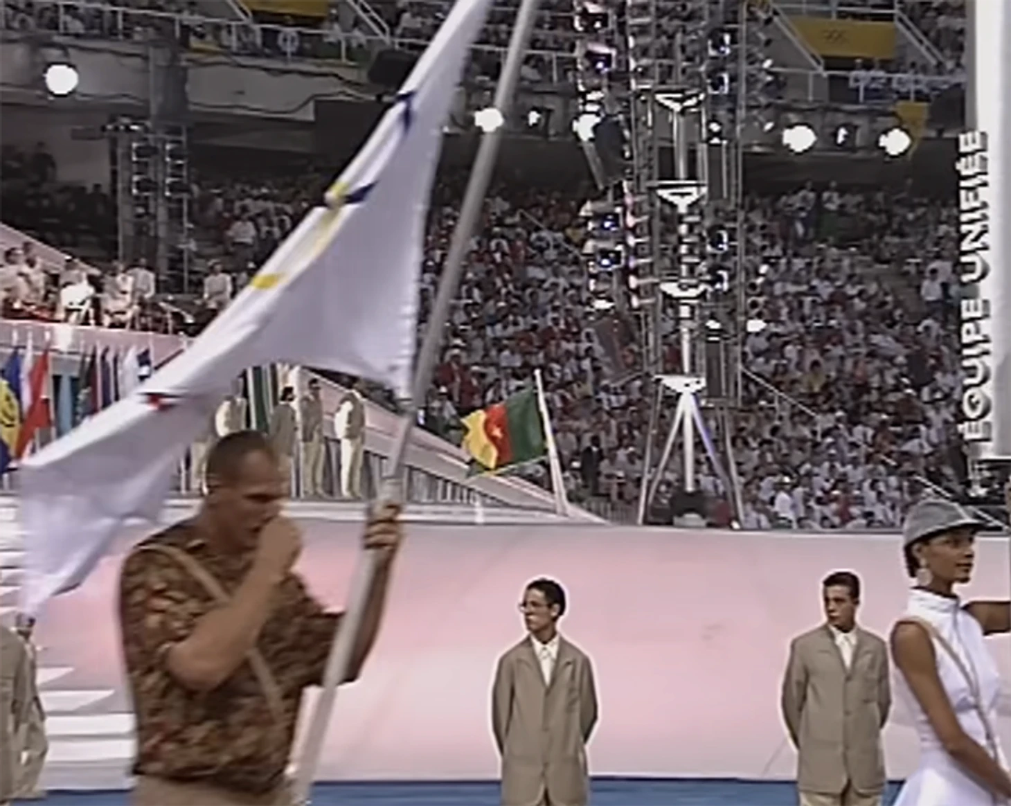 В 1992 году национальные олимпийские комитеты бывших республик СССР еще не успели получить признание МОК после развала СССР, так что на летних и зимних Играх того года (да, они проходили в один год) бывшие советские спортсмены выступали под флагом Объединенной команды.