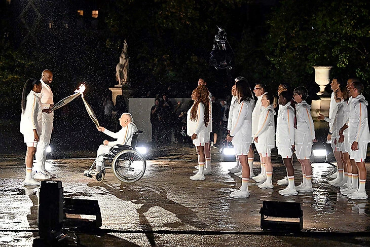 Финальная передача огня – старейший олимпийский чемпион Франции Мишель Кост (ему 100 лет!) зажигает факел Тедди Ринера и Мари-Жозе Перек.
