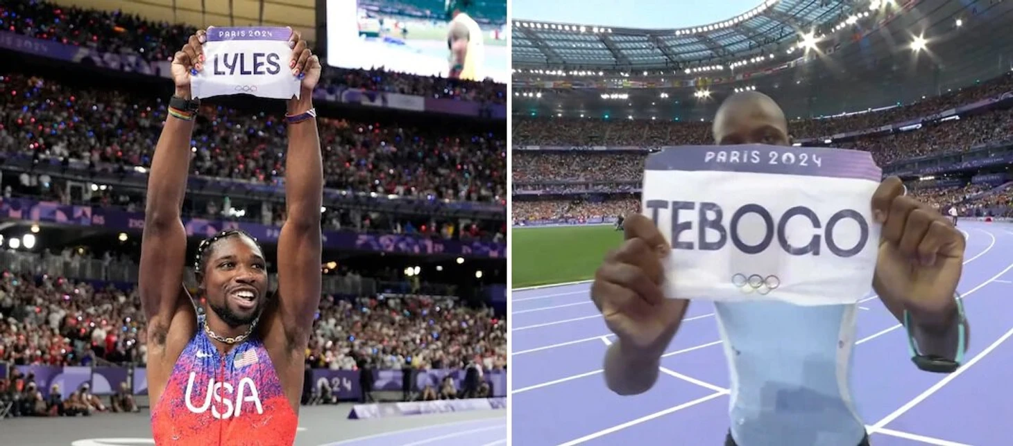 А в это время Тебого закосплеил самого Лайлса – повторил его движение после победы на 100 м и тоже сорвал стартовый номер и показал в камеру.