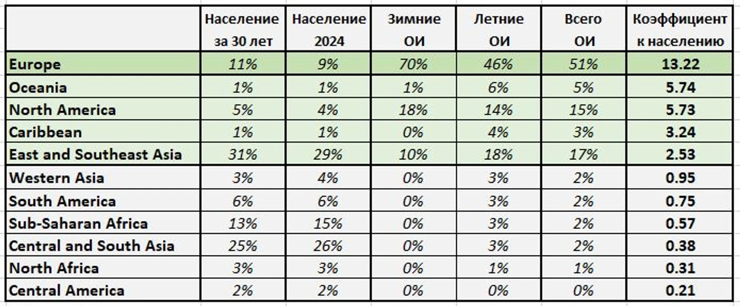 Что здесь интересно? Очень хорошо видно что Олимпиады хоть и вроде глобальные явления - имеют совершенно не глобальный охват с точки зрения побед и медалей. Большая часть мира в этом процессе вообще никак не участвует. Есть один совершенно доминирующий регион - Европа - который имя всего 11% населения мира в этот период времени в целом (средняя численность между данными за 1995 и 2024 год для простоты анализа), и при этом нулевой рост за этот период (всего 2% при среднем по миру 42%) - имеет 70% наград зимних игр и 46% наград летних - и более половины всех медалей вообще. Очень сильный перекос.