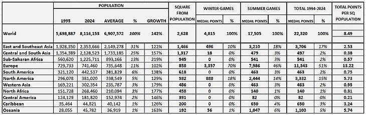 Есть еще несколько регионов активно участвующих в Играх с точки зрения побед, а не просто участия - Восточная и Юго-Восточная Азия (в основном за счет Китая, Японии и Кореи, именно Юго-Восточная Азия не учавствует в играх практически никак) - но тем не менее регион берет 17% медалей (хотя на три ведущие страны приходится парктически 15%), понятно Северня Америка в лице двух государств - 15% (но там только одни Штаты берут 12%), ну и Океания (5% за счет 2-х стран) и как ни странно Карибы (3%). По сути на эти 5 регионов мира, где проживало в данном 30-летнем периоде менее половины мирового населения (48%, а если брать только 2024 год то уже 44% и эта доля будет постоянно падать дальше) приходится 99,6% всех зимних наград, 88% летних и более 90% вообще. Все остальные 6 крупных регионов мира - Северная и Суб-сахарская Африка, Центральная, Южная и Западная Азия, Центральная Америка и что особенно удивительно вся Южная Америка - на Олимпийских играх присутствует довольно формально. Они там вроде и есть - но в медальном зачете страны этих регионов, где живет большая часть населения мира - найти будет довольно тяжело.