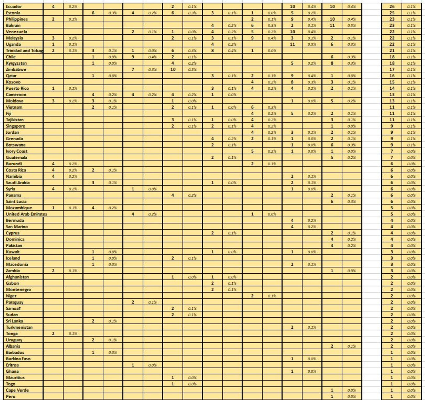 В топ-20 из не богатых кроме России стран попали только Венгрия (23 тыс), Куба (10 тыс.) и Ямайка (7 тыс.). Как считать Словению и Чехию непонятно - они быстро приближаются к первому миру - пока у них 34 и 30 тысячи - они где то посередине. В топ-30 еще есть Хорватия (23) и Беларусь (8).