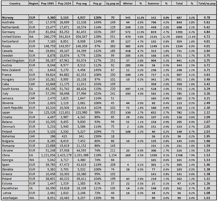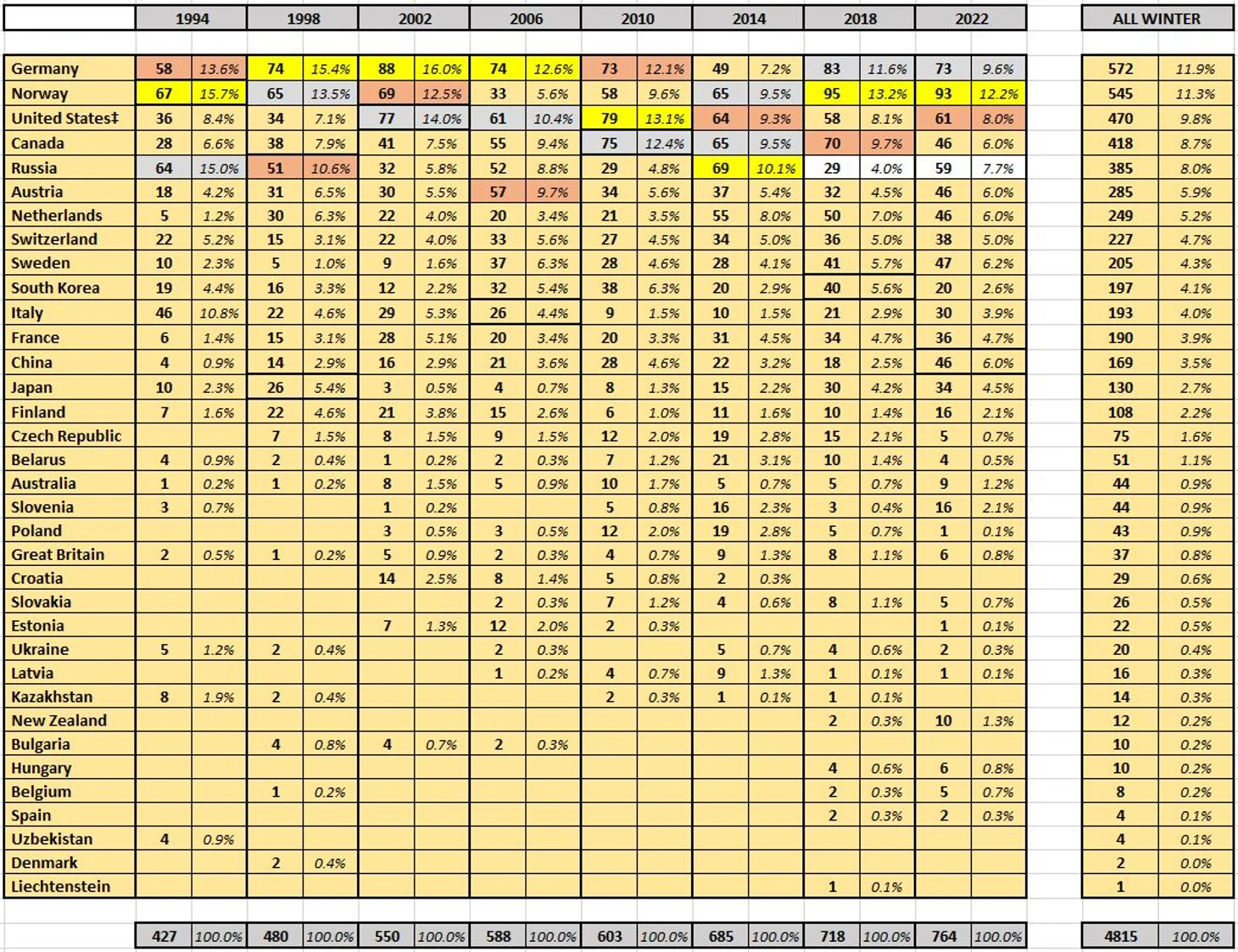 Германия является самой успешной в зимних видах - 11,9% всех средневзвешенных медалей, в период с 1998 по 2006 год они особенно доминировали, выиграв три Олимпиады с пиком в 2002 году - 16% (кстати это абсолютный рекорд всех 16 игр за этот период вообще, в т.ч. летних). Норвежцы дома в 1994 году показали 15,7% - но потом у них был спад вплоть до 5,6% в 2006 - но последние 2 ЗОИ они снова лучшие. Но в целом пока немцам немного уступают. Впрочем если в 2026 году они повторят результаты 2022 - то уже в Италии немцев они могут обойти.