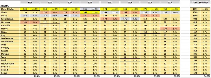 Обращает внимание что на первых 5 ОИ ведущие страны совокупно имели около 76%, а на последних играх уже 72-73% - что означает что конкуренция на Играх со стороны стран второго эшелона начала расти. Если брать только 10 топовых стран то у них когда-то было по 57-59% - сейчас уже 55 и меньше. И Игры в Париже это показали - многие страны второго эшелона выступили очень удачно, те же узбеки, шведы, иранцы и т.д.