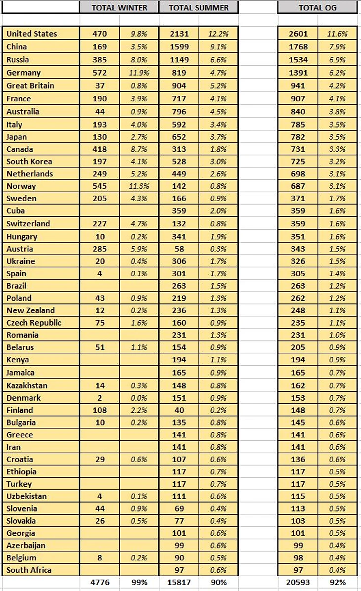 У Китая наоборот плюс 5,6% в пользу лета, у UK 4,4%. Австралии 3,6%, ну и единственная из топ-20 стран кто все медали взял только летом - это конечно Куба, сложно представить где они могли бы побороться зимой - у них соответственно +2%.