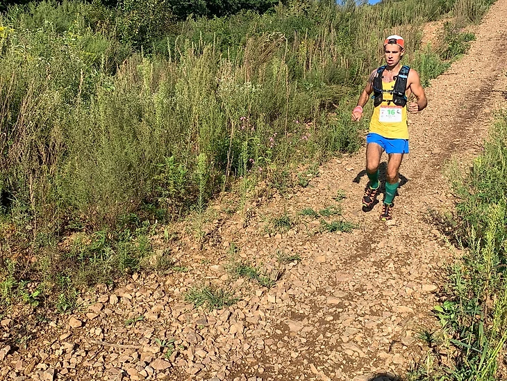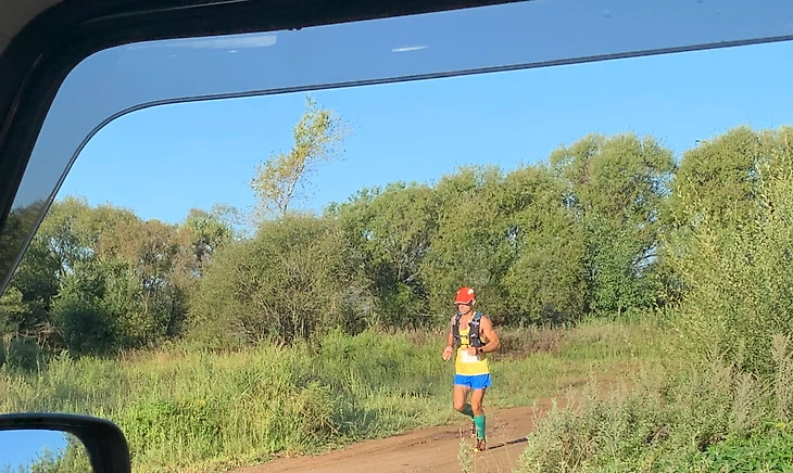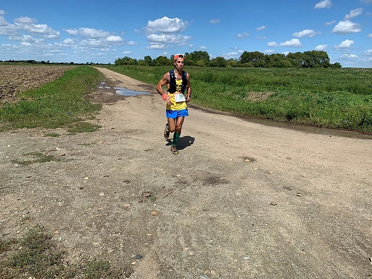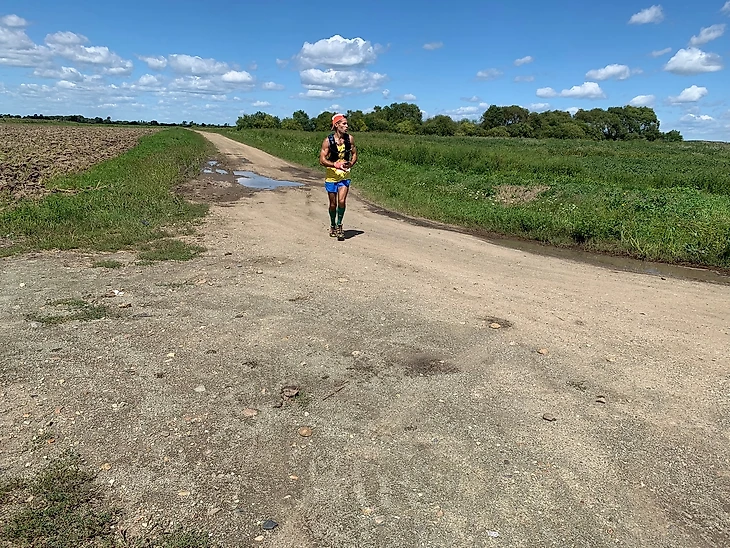 Продолжаем бежать по дороге с кукурузными полями до села Загородное, расположенного на 38 километре дистанции. Выбегаем на асфальтовую дорогу с крафтовой обстановкой запущенной глубинки, где половину асфальтовой дороги ограничено необрезанными ветвями кустов/деревьев и ошеломленными глазами аборигенов. Бежим до контрольного пункта (39 километров). Уже начинают ощущаться «волновые» приходы, смена настроения. Несмотря на это, продолжаю планово (в питании даже прибавлять объем) питаться/пить и равномерно распределять усилия. Продолжаю умеренно бежать по гравийной дороге вдоль бескрайних полей и стариц. Самый неудобный для стоп ноги и менталки участок дистанции – однообразный мелкий/средний гравий, который приносит небольшие, но назойливые неудобства.
