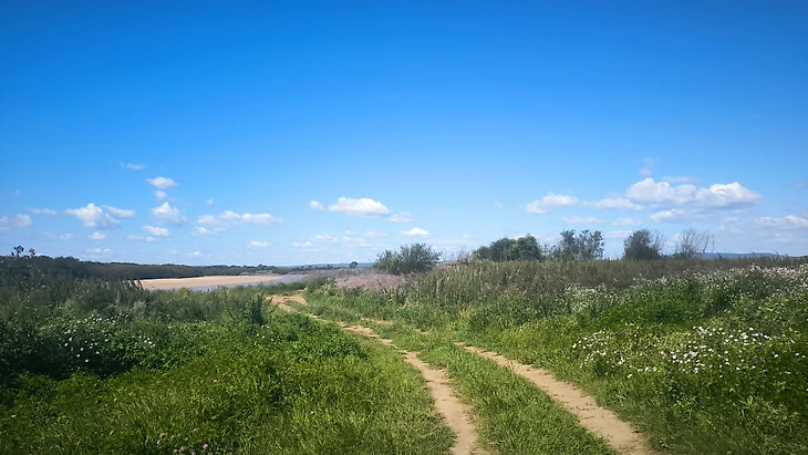 Повороты, снова повороты, и дороги с развилками. Начинается небольшой и плавный подъем на карьер с озером (47 километр). Поворот, и по степным тропам с небольшим набором высоты до развилки с дорогой, где снова поворот на спуск по широкой полевой дороге до пересечения с железнодорожными путями (49 километр).