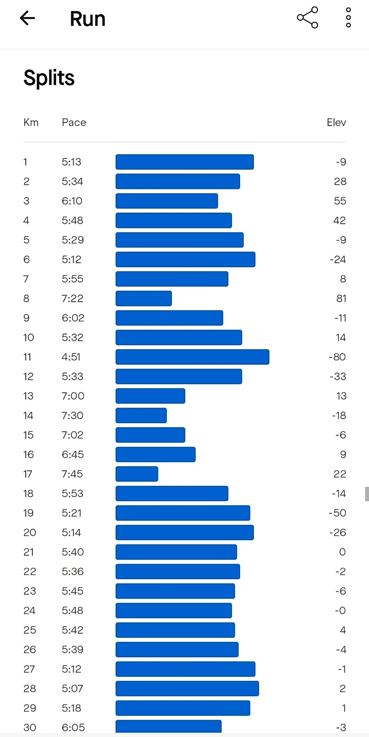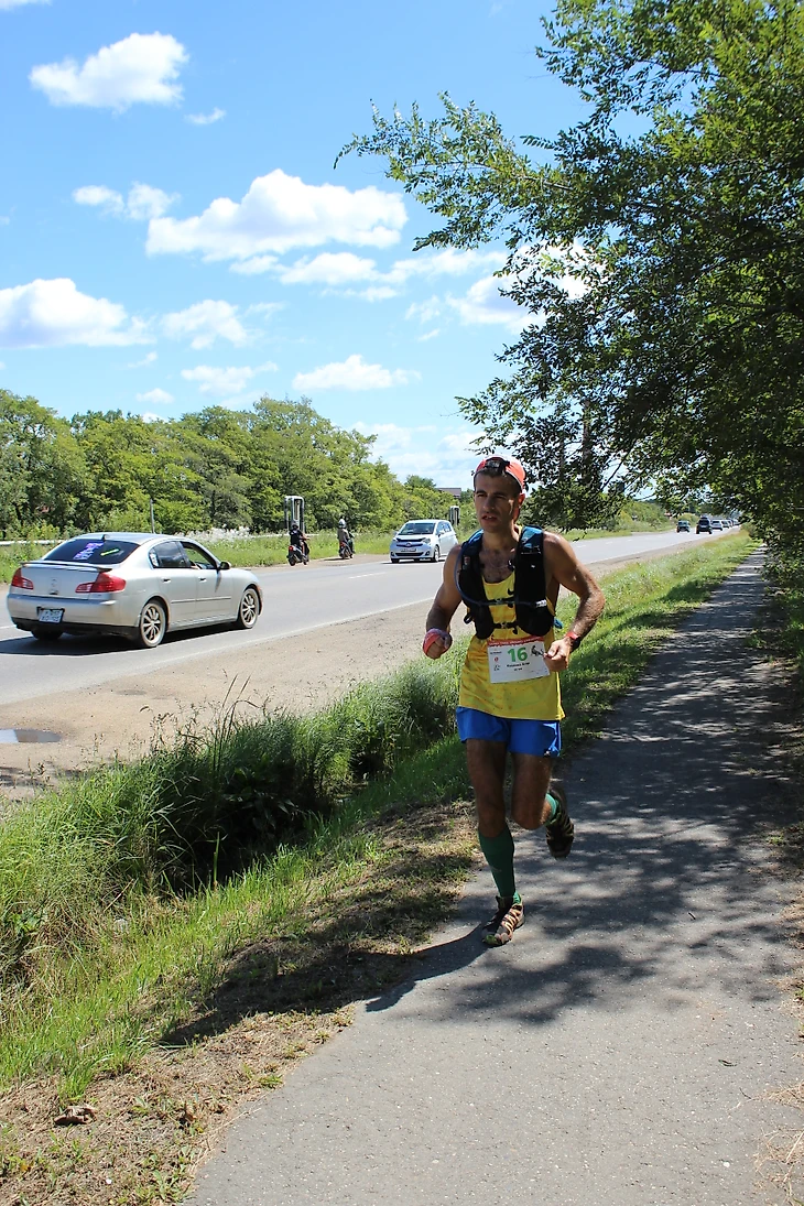 Забегаем на дамбу и бежим по ней до парка «Зеленый остров». На дамбе встречались собаки без привязи, но с хозяевами, обошлось без инцидентов. После чего следует бег по затененным дорожкам парка, контрольный пункт (28 километров) и затем, дороги, проулки среди улиц малоэтажной застройки и гаражных кооперативов – удивительный опыт разнообразия смены беговой обстановки. По узким проулкам выбегаем на следующие улицы по заблаговоременно установленному треку. Повороты, спуски, бег до моста, после чего снова дамба и бег по ней (31 километр дистанции).
