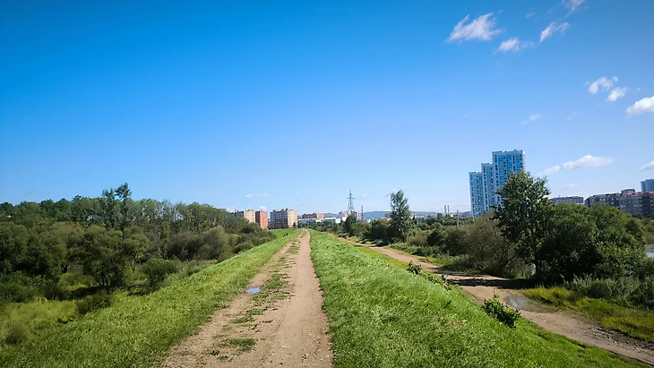 Полевая дорога и выход на асфальт (19 километр), с интенсивным движением автомобилей. Дорога с широкой бровкой, поэтому бежать комфортно. Добежали до путепровода и повернули на любимую полевую дорогу. По полевой дороге и дорогам с множеством луж вновь до дороги с интенсивным движением автомобилей, где также спасает широкая бровка. Добегаем до поворота к реке, пробегаем вдоль реки под мостами и поворачиваем на легендарную и всемирно известную дамбу, расположенную на 25 километре.