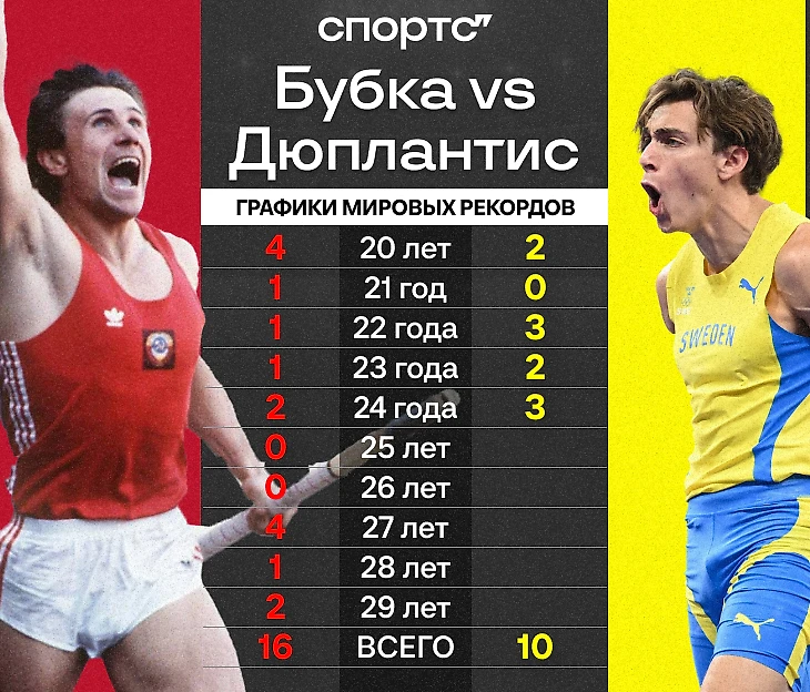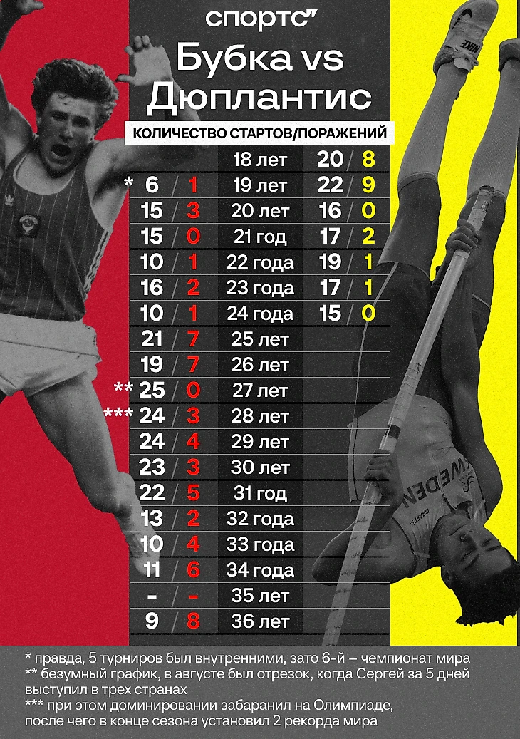 Потому что Сергей Бубка в 80-е и 90-е тоже выдавал что-то магическое. И мы в цифрах покажем, что Дюплантису предстоит многое сделать, чтобы превзойти советскую легенду по всем параметрам.