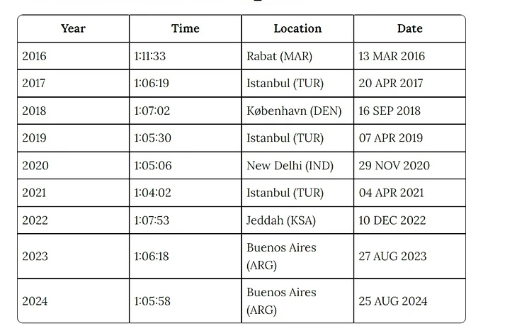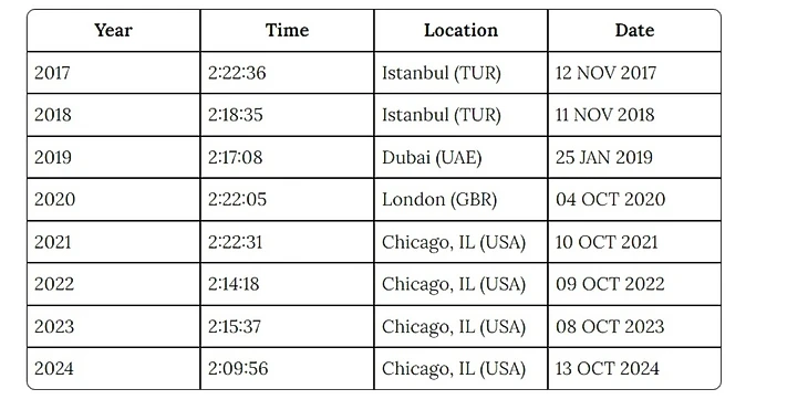 Прежде чем углубимся в детали, для справки рассмотрим сплиты Чепнгетич на Чикагском марафоне 2024 года, а также ее прогресс за эти годы.