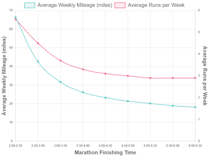 Общепринятое мнение о еженедельном объеме марафонских тренировок заключается в том, что новички должны стремиться пробегать не менее (40 км), а бегуны среднего уровня — (56–80 км). Фактические данные свидетельствуют о том, что большинство марафонцев-любителей пробегают меньше километров, чем им советуют тренеры. На диаграмме выше можно видеть, что средний бегун с финишным временем марафона менее 4 часов пробегает чуть менее (40 км) в неделю. Данные не показывают уровень травматизма.