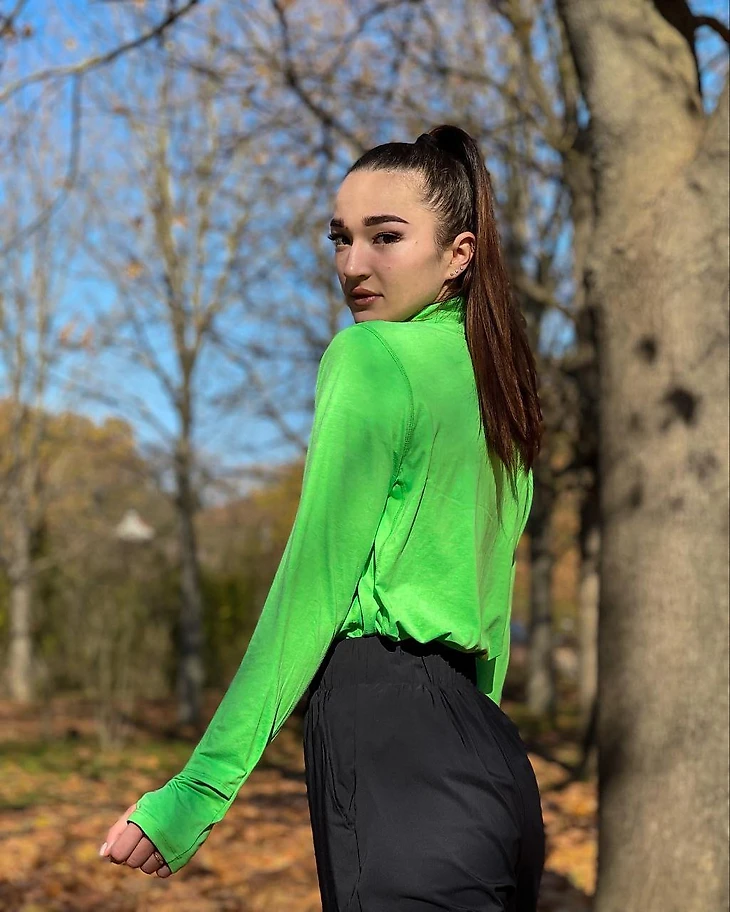 Только фото в зеленой олимпийке с длинными рукавами и трениками, причём одно заправленное в другое + отштукатуренное лицо...