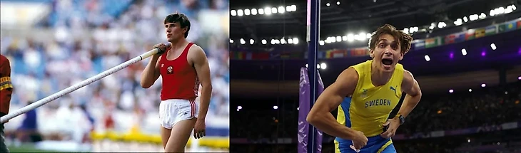 Точнее прыгают, но почему-то только с шестом. Видимо шестовые технологии, такие бывают такие, далеко шагнули вперед. В заочной битве двух величайших чемпионов побеждает шведский прыгунок, да еще и с мировым рекордом