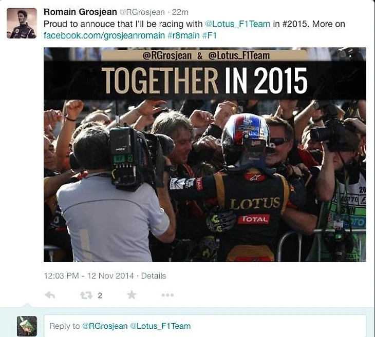 «Рад объявить, что буду выступать за «Лотус» в 2015 году», – написал Грожан.
