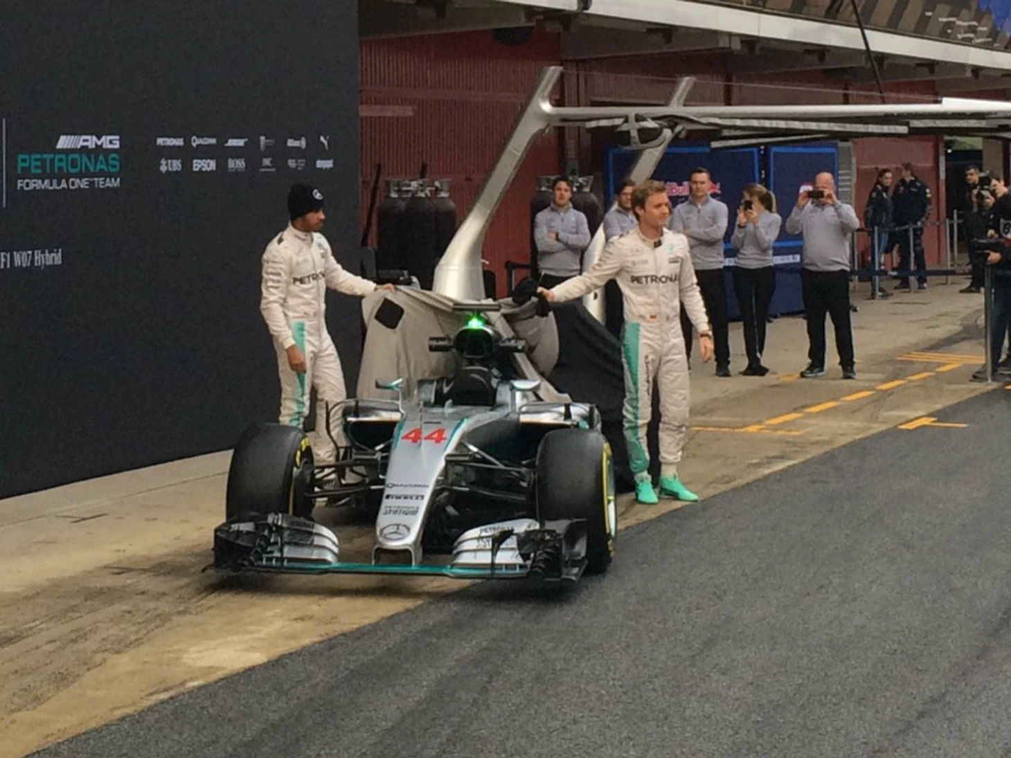 В ходе мероприятия, организованного прямо на пит-лейне автодрома «Барселона-Каталония», Нико Росберг и Льюис Хэмилтон сняли с нового автомобиля черное покрывало и приняли участие в фотосессии.