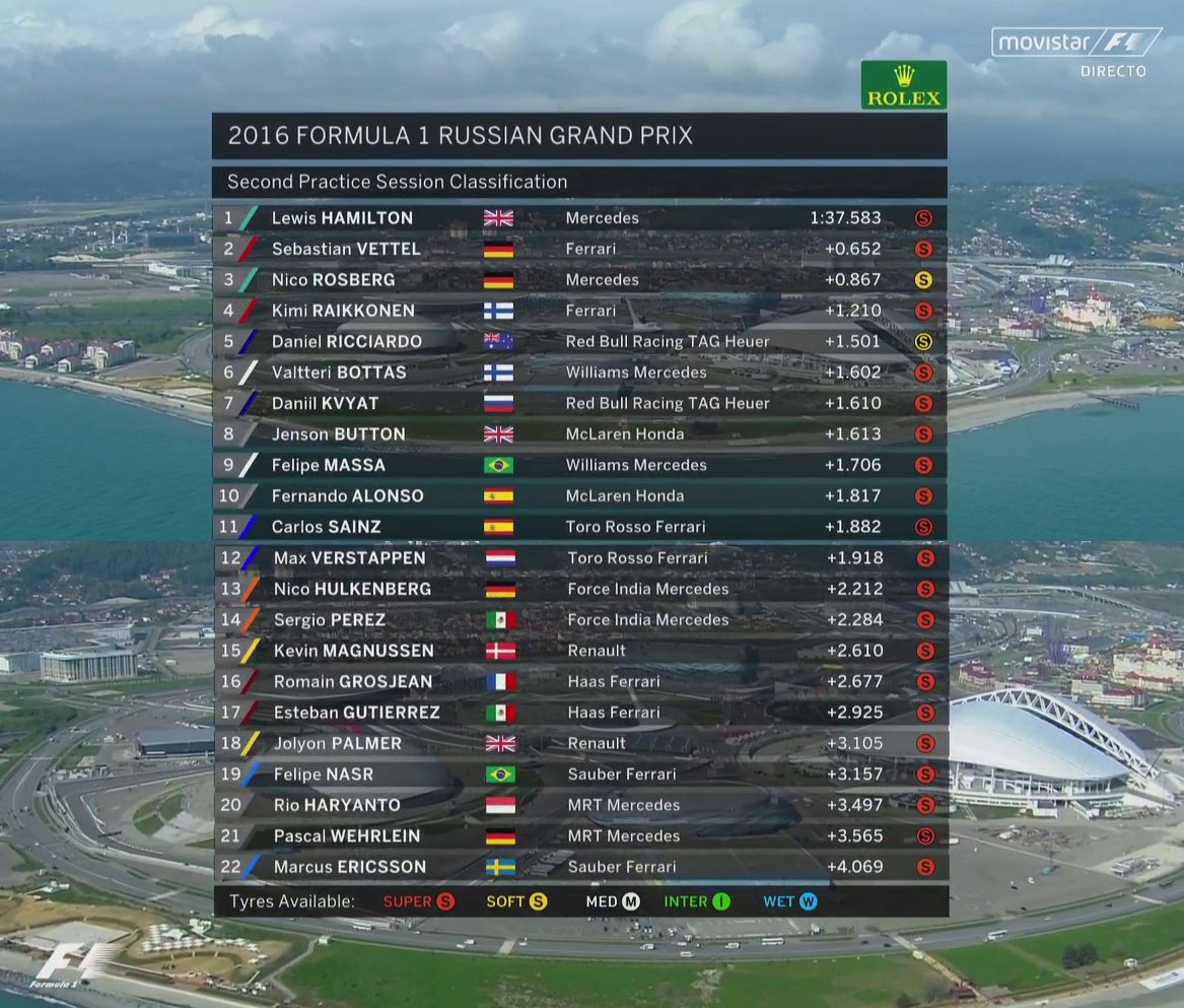 Гран-при России. 2-я практика. Хэмилтон – первый, Феттель – второй, Росберг – третий, Квят – седьмой, все результаты