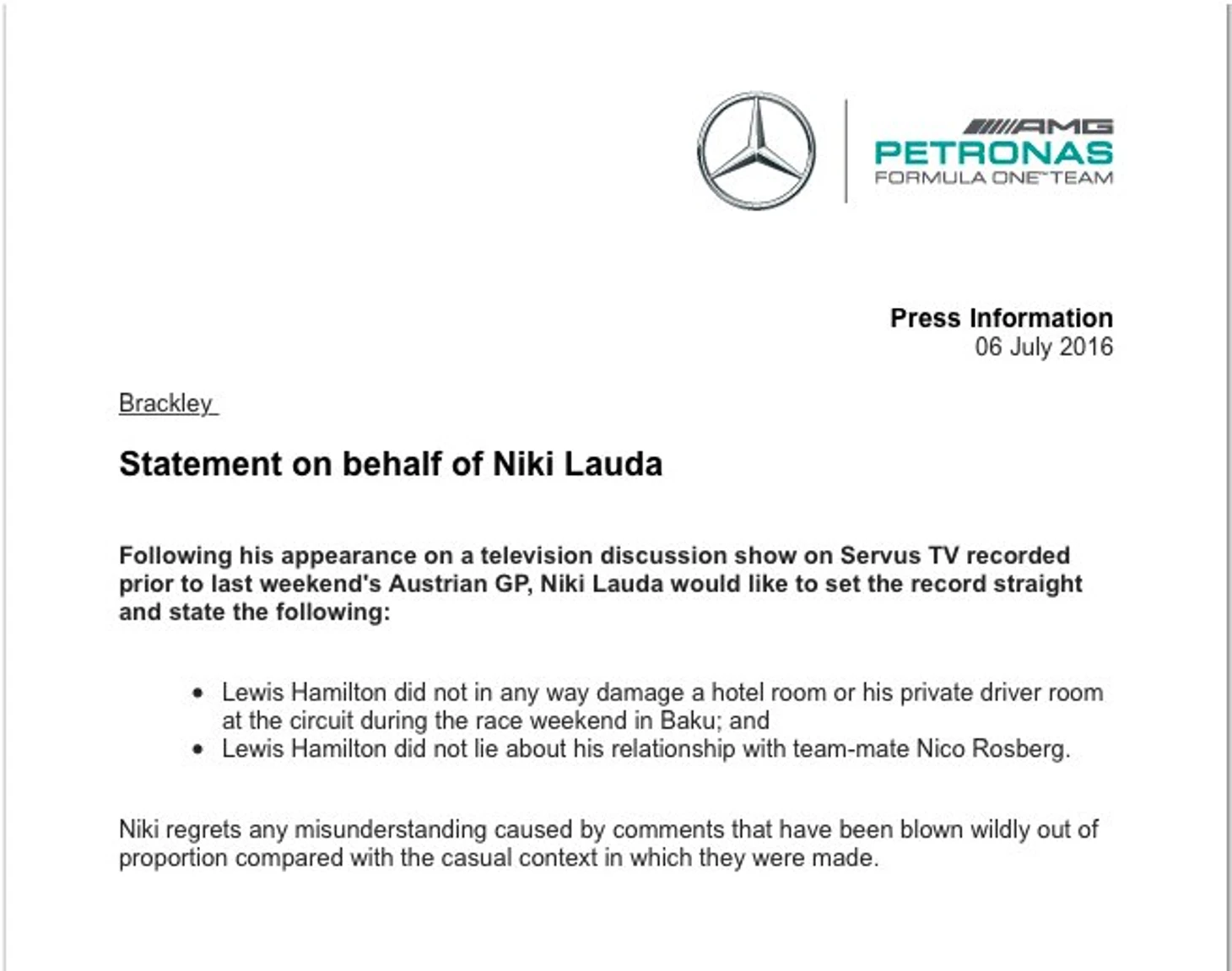 Команда «Мерседес» выпустила пресс-релиз, посвященный недавнему высказыванию неисполнительного директора Ники Лауды о словах и действиях Льюиса Хэмилтона.