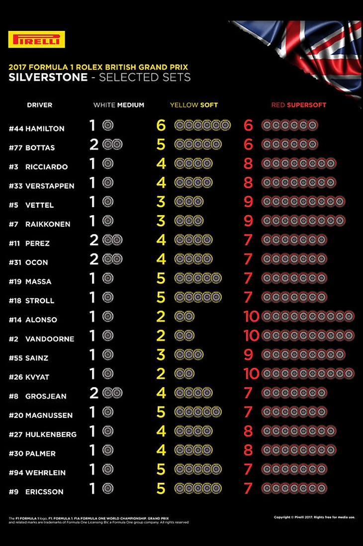 Выбор шин на Гран-при Великобритании (в таблице указано количество комплектов на гонщика)