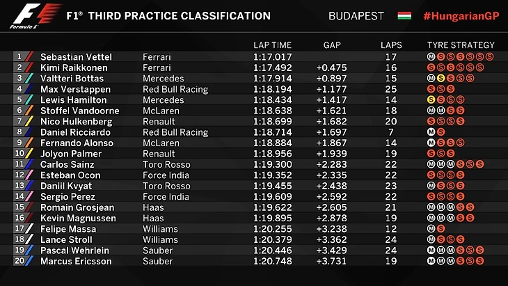 Гран-при ВенгрииХунгароринг, Будапешт29 июля 2017 года3-я практика1. Себастьян Феттель («Феррари») – 1.17,017 (17 кругов)2. Кими Райкконен («Феррари») +0,475 (16)3. Валттери Боттас («Мерседес») +0,897 (15)4. Макс Ферстаппен («Ред Булл») +1,177 (25)5. Льюис Хэмилтон («Мерседес») +1,417 (14)6. Стоффель Вандорн («Макларен») +1,621 (18)7. Нико Хюлькенберг («Рено») +1,682 (20)8. Даниэль Риккардо («Ред Булл») +1,697 (7)9. Фернандо Алонсо («Макларен») +1,867 (14)10. Джолион Палмер («Рено») +1,939 (19)11. Карлос Сайнс-младший («Торо Россо») +2,283 (22)12. Эстебан Окон («Форс-Индия») +2,335 (22)13. Даниил Квят («Торо Россо») +2,438 (23)14. Серхио Перес («Форс-Индия») +2,592 (22)15. Ромен Грожан («Хаас») +2,605 (21)16. Кевин Магнуссен («Хаас») +2,878 (19)17. Фелипе Масса («Уильямс») +3,238 (12)18. Ланс Стролл («Уильямс») +3,362 (24)19. Паскаль Верляйн («Заубер») +3,429 (24)20. Маркус Эрикссон («Заубер») +3,731 (19)