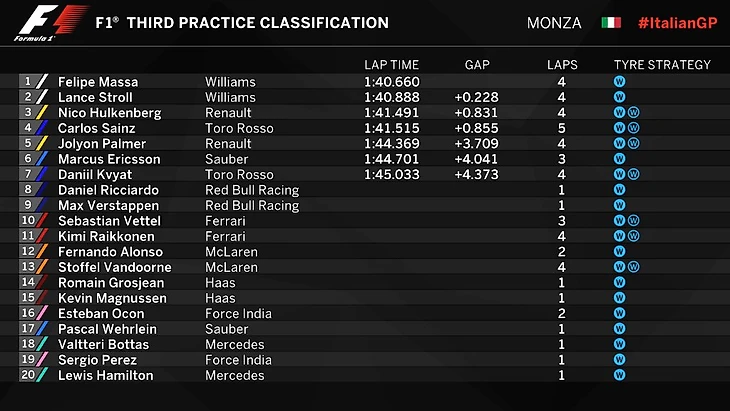 Гран-при ИталииАвтодром Монца, Монца2 сентября 2017 года3-я практика1. Фелипе Масса («Уильямс») – 1.40,660 (4 круга)2. Ланс Стролл («Уильямс») +0,228 (4)3. Нико Хюлькенберг («Рено») +0,831 (4)4. Карлос Сайнс-младший («Торо Россо») +0,855 (5)5. Джолион Палмер («Рено») +3,709 (4)6. Маркус Эрикссон («Заубер») +4,041 (3)7. Даниил Квят («Торо Россо») +4,373 (4)8. Даниэль Риккардо («Ред Булл») (1)9. Макс Ферстаппен («Ред Булл») (1)10. Себастьян Феттель («Феррари») (3)11. Кими Райкконен («Феррари») (4)12. Фернандо Алонсо («Макларен») (2)13. Стоффель Вандорн («Макларен») (4)14. Ромен Грожан («Хаас») (1)15. Кевин Магнуссен («Хаас») (1)16. Эстебан Окон («Форс-Индия») (2)17. Паскаль Верляйн («Заубер») (1)18. Валттери Боттас («Мерседес») (1)19. Серхио Перес («Форс-Индия») (1)20. Льюис Хэмилтон («Мерседес») (1)