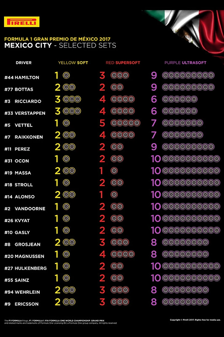 Выбор шин на Гран-при Мексики (в таблице указано количество комплектов на гонщика)