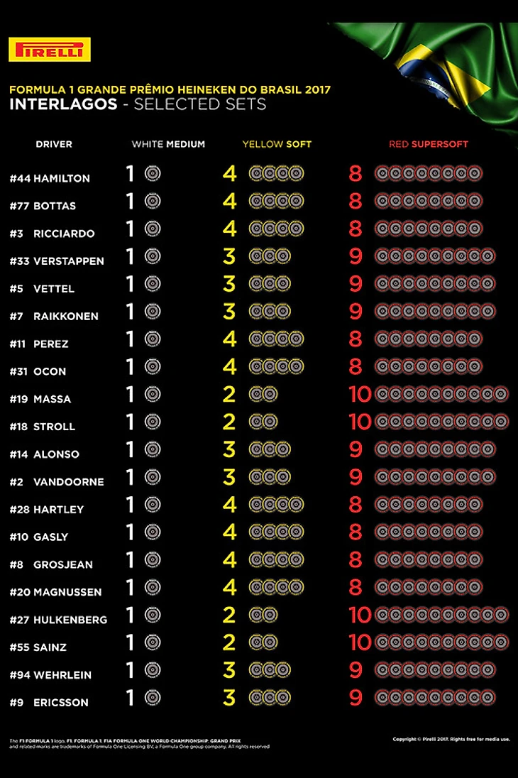 Компания «Пирелли» опубликовала информацию о выборе командами шин на Гран-при Бразилии, сообщает autosport.