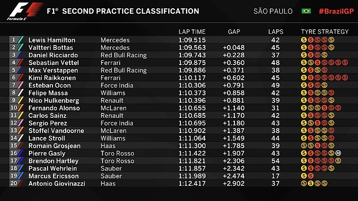 Гран-при БразилииАвтодром имени Жозе Карлуса Пасе, Интерлагос10 ноября 2017 года2-я практика1. Льюис Хэмилтон («Мерседес») – 1.09,515 (42 круга)2. Валттери Боттас («Мерседес») +0,048 (45)3. Даниэль Риккардо («Ред Булл») +0,228 (37)4. Себастьян Феттель («Феррари») +0,360 (48)5. Макс Ферстаппен («Ред Булл») +0,371 (38)