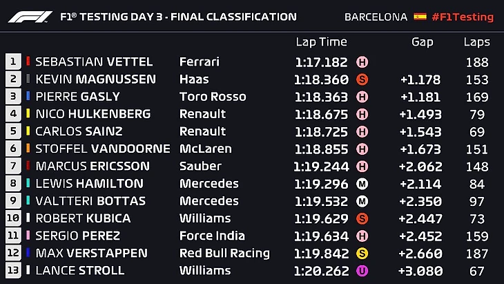 Тесты. Барселона. 3-й день. Феттель показал лучшее время, Магнуссен – второй, Гасли – третий