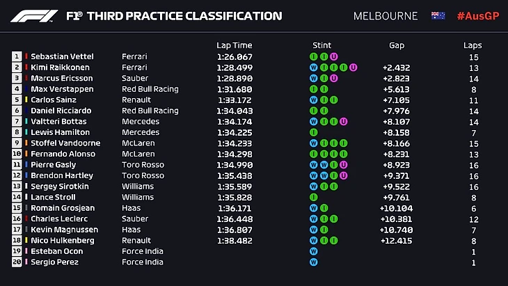 Гран-при АвстралииАльберт-парк, Мельбурн24 марта 2018 года3-я практика1. Себастьян Феттель («Феррари») – 1.26,067 (15 кругов)2. Кими Райкконен («Феррари») +2,432 (13)3. Маркус Эрикссон («Заубер») +2,823 (14)4. Макс Ферстаппен («Ред Булл») +5,613 (8)5. Карлос Сайнс-младший («Рено») +7,105 (11)6. Даниэль Риккардо («Ред Булл») +7,976 (14)7. Валттери Боттас («Мерседес») +8,107 (14)8. Льюис Хэмилтон («Мерседес») +8,158 (7)9. Стоффель Вандорн («Макларен») +8,166 (15)10. Фернандо Алонсо («Макларен») +8,231 (13)11. Пьер Гасли («Торо Россо») +8,923 (16)12. Брендон Хартли («Торо Россо») +9,371 (16)13. Сергей Сироткин («Уильямс») +9,522 (16)14. Ланс Стролл («Уильямс») +9,761 (8)15. Ромен Грожан («Хаас») +10,104 (6)16. Шарль Леклер («Заубер») +10,381 (12)17. Кевин Магнуссен («Хаас») +10,740 (7)18. Нико Хюлькенберг («Рено») +12,415 (8)19. Эстебан Окон («Форс-Индия») – (1)20. Серхио Перес («Форс-Индия») – (1)