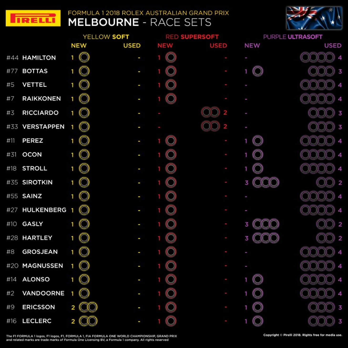 Пресс-служба «Пирелли» опубликовала данные об оставшихся в распоряжении команд комплектах шин перед Гран-при Австралии.