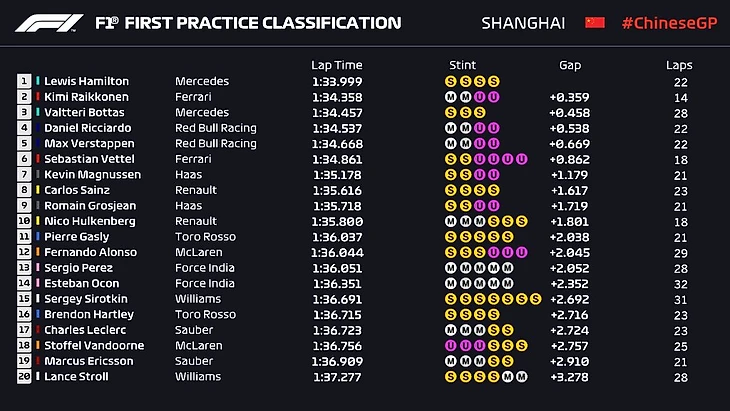 Гран-при КитаяШанхай Интернэшнл, Шанхай13 апреля 2018 года1-я практика 1. Льюис Хэмилтон («Мерседес») – 1.33,999 (22 круга)2. Кими Райкконен («Феррари») +0,359 (14)3. Валттери Боттас («Мерседес») +0,458 (28)4. Даниэль Риккардо («Ред Булл») +0,538 (22)5. Макс Ферстаппен («Ред Булл») +0,669 (22)6. Себастьян Феттель («Феррари») +0,862 (18)7. Кевин Магнуссен («Хаас») +1,179 (21)8. Карлос Сайнс-младший («Рено») +1,617 (23)9. Ромен Грожан («Хаас») +1,719 (21)10. Нико Хюлькенберг («Рено») +1,801 (18)11. Пьер Гасли («Торо Россо») +2,038 (21)12. Фернандо Алонсо («Макларен») +2,045 (29)13. Серхио Перес («Форс-Индия») +2,052 (28)14. Эстебан Окон («Форс-Индия») +2,352 (32)15. Сергей Сироткин («Уильямс») +2,692 (31)16. Брендон Хартли («Торо Россо») +2,716 (23)17. Шарль Леклер («Заубер») +2,724 (23)18. Стоффель Вандорн («Макларен») +2,757 (25)19. Маркус Эрикссон («Заубер») +2,910 (21)20. Ланс Стролл («Уильямс») +3,278 (28)