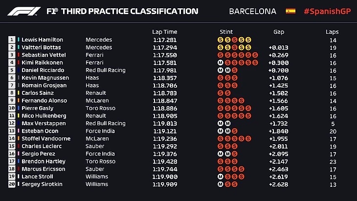 Гран-при ИспанииБарселона-Каталония, Монмело12 мая 2018 года3-я практика 1. Льюис Хэмилтон («Мерседес») – 1.17,281 (14 кругов)2. Валттери Боттас («Мерседес») +0,013 (19)3. Себастьян Феттель («Феррари») +0,269 (16)4. Кими Райкконен («Феррари») +0,300 (16)5. Даниэль Риккардо («Ред Булл») +0,700 (16)6. Кевин Магнуссен («Хаас») +1,076 (15)7. Ромен Грожан («Хаас») + 1,425 (16)8. Карлос Сайнс-младший («Рено») + 1,502 (16)9. Фернандо Алонсо («Макларен») +1,566 (14)10. Пьер Гасли («Торо Россо») +1,605 (16)11. Нико Хюлькенберг («Рено») +1,624 (16)12. Макс Ферстаппен («Ред Булл») +1,732 (5)13. Эстебан Окон («Форс-Индия») +1,840 (20)14. Стоффель Вандорн («Макларен») +1,955 (17)15. Шарль Леклер («Заубер») +2,011 (19)16. Серхио Перес («Форс-Индия») +2,095 (17)17. Брендон Хартли («Торо Россо») +2,147 (23)18. Маркус Эрикссон («Заубер») +2,463 (17)19. Ланс Стролл («Уильямс») +2,619 (15)20. Сергей Сироткин («Уильямс») +2,628 (13)