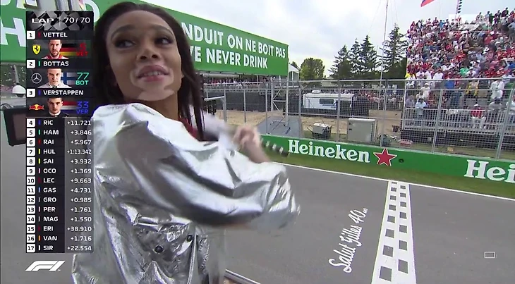 Модель Винни Харлоу взмахнула флагом на 69-м круге гонки из 70. Согласно статье 43.2 спортивного регламента «Формулы-1», официальным результатом признаны позиции, закрепившиеся по итогам 68-го круга.