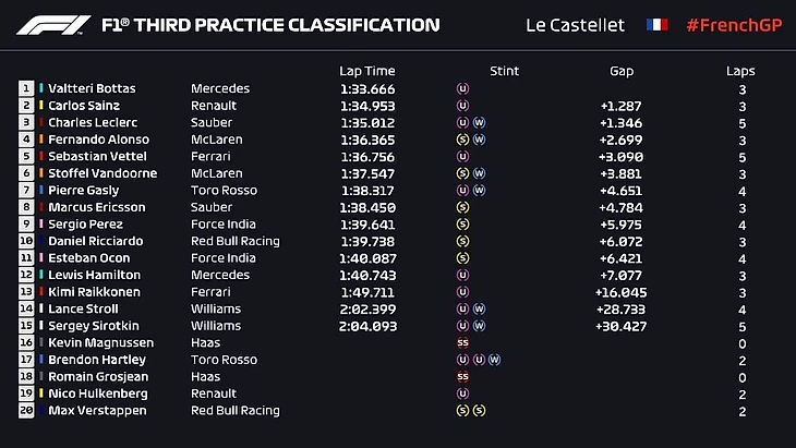 Гран-при ФранцииПоль-Рикар, Ле-Кастелле23 июня 2018 года3-я практика 1. Валттери Боттас («Мерседес») – 1.33,666 (3 круга)2. Карлос Сайнс-младший («Рено») +1,287 (3)3. Шарль Леклер («Заубер») +1,346 (5)4. Фернандо Алонсо («Макларен») +2,699 (3)5. Себастьян Феттель («Феррари») +3,090 (5)6. Стоффель Вандорн («Макларен») +3,881 (3)7. Пьер Гасли («Торо Россо») +4,651 (4)8. Маркус Эрикссон («Заубер») +4,784 (3)9. Серхио Перес («Форс-Индия») +5,975 (4)10. Даниэль Риккардо («Ред Булл») +6,072 (3)11. Эстебан Окон («Форс-Индия») +6,421 (4)12. Льюис Хэмилтон («Мерседес») +7,077 (3)13. Кими Райкконен («Феррари») +16,045 (3)