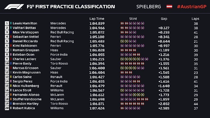 Гран-при АвстрииРед Булл Ринг, Шпильберг29 июня 2018 года1-я практика 1. Льюис Хэмилтон («Мерседес») – 1.04,839 (38 кругов)2. Валттери Боттас («Мерседес») +0,127 (38)3. Макс Ферстаппен («Ред Булл») +0,233 (41)4. Себастьян Феттель («Феррари») +0,341 (28)5. Даниэль Риккардо («Ред Булл») +0,644 (21)6. Кими Райкконен («Феррари») +0,937 (30)7. Ромен Грожан («Хаас») +1,189 (30)8. Эстебан Окон («Форс-Индия») +1,216 (39)9. Шарль Леклер («Заубер») +1,376 (30)10. Пьер Гасли («Торо Россо») +1,555 (35)11. Маркус Эрикссон («Заубер») +1,561 (31)12. Кевин Магнуссен («Хаас») +1,565 (23)13. Карлос Сайнс-младший («Рено») +1,588 (28)14. Серхио Перес («Форс-Индия») +1,616 (41)15. Нико Хюлькенберг («Рено») +1,640 (34)16. Ланс Стролл («Уильямс») +1,728 (31)17. Фернандо Алонсо («Макларен») +1,773 (29)18. Стоффель Вандорн («Макларен») +1,859 (29)19. Брендон Хартли («Торо Россо») +2,032 (44)20. Роберт Кубица («Уильямс») +2,585 (37)