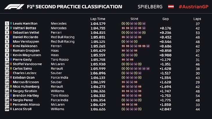 Гран-при АвстрииРед Булл Ринг, Шпильберг29 июня 2018 года2-я практика 1. Льюис Хэмилтон («Мерседес») – 1.04,579 (37 кругов)2. Валттери Боттас («Мерседес») +0,176 (42)3. Себастьян Феттель («Феррари») +0,236 (53)4. Даниэль Риккардо («Ред Булл») +0,452 (48)5. Макс Ферстаппен («Ред Булл») +0,546 (48)6. Кими Райкконен («Феррари») +0,686 (42)7. Ромен Грожан («Хаас») +0,850 (37)8. Кевин Магнуссен («Хаас») +0,980 (41)9. Пьер Гасли («Торо Россо») +1,179 (31)10. Стоффель Вандорн («Макларен») +1,351 (46)11. Карлос Сайнс-младший («Рено») +1,420 (38)12. Шарль Леклер («Заубер») +1,517 (30)13. Эстебан Окон («Форс-Индия») +1,554 (43)14. Маркус Эрикссон («Заубер») +1,620 (29)15. Нико Хюлькенберг («Рено») +1,694 (42)16. Сергей Сироткин («Уильямс») +1,747 (48)17. Брендон Хартли («Торо Россо») +1,753 (54)18. Серхио Перес («Форс-Индия») +1,775 (48)19. Фернандо Алонсо («Макларен») +1,850 (33)20. Ланс Стролл («Уильямс») +2,047 (44)