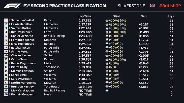 Гран-при ВеликобританииСильверстоун6 июля 2018 года2-я практика 1. Себастьян Феттель («Феррари») – 1.27,552 (35 кругов)2. Льюис Хэмилтон («Мерседес») +0,187 (31)3. Валттери Боттас («Мерседес») +0,357 (29)4. Кими Райкконен («Феррари») +0,493 (34)5. Даниэль Риккардо («Ред Булл») +0,856 (31)6. Фернандо Алонсо («Макларен») +1,754 (31)7. Нико Хюлькенберг («Рено») +1,802 (34)8. Эстебан Окон («Форс-Индия») +1,915 (32)9. Серхио Перес («Форс-Индия») +1,970 (31)10. Шарль Леклер («Заубер») +2,005 (30)11. Карлос Сайнс-младший («Рено») +2,011 (35)12. Кевин Магнуссен («Хаас») +2,065 (32)13. Пьер Гасли («Торо Россо») +2,279 (16)14. Маркус Эрикссон («Заубер») +2,494 (31)15. Ланс Стролл («Уильямс») +2,517 (33)16. Сергей Сироткин («Уильямс») +2,551 (35)17. Стоффель Вандорн («Макларен») +2,569 (30)18. Брендон Хартли («Торо Россо») +2,852 (35)19. Макс Ферстаппен («Ред Булл») - (2)20. Ромен Грожан («Хаас») -