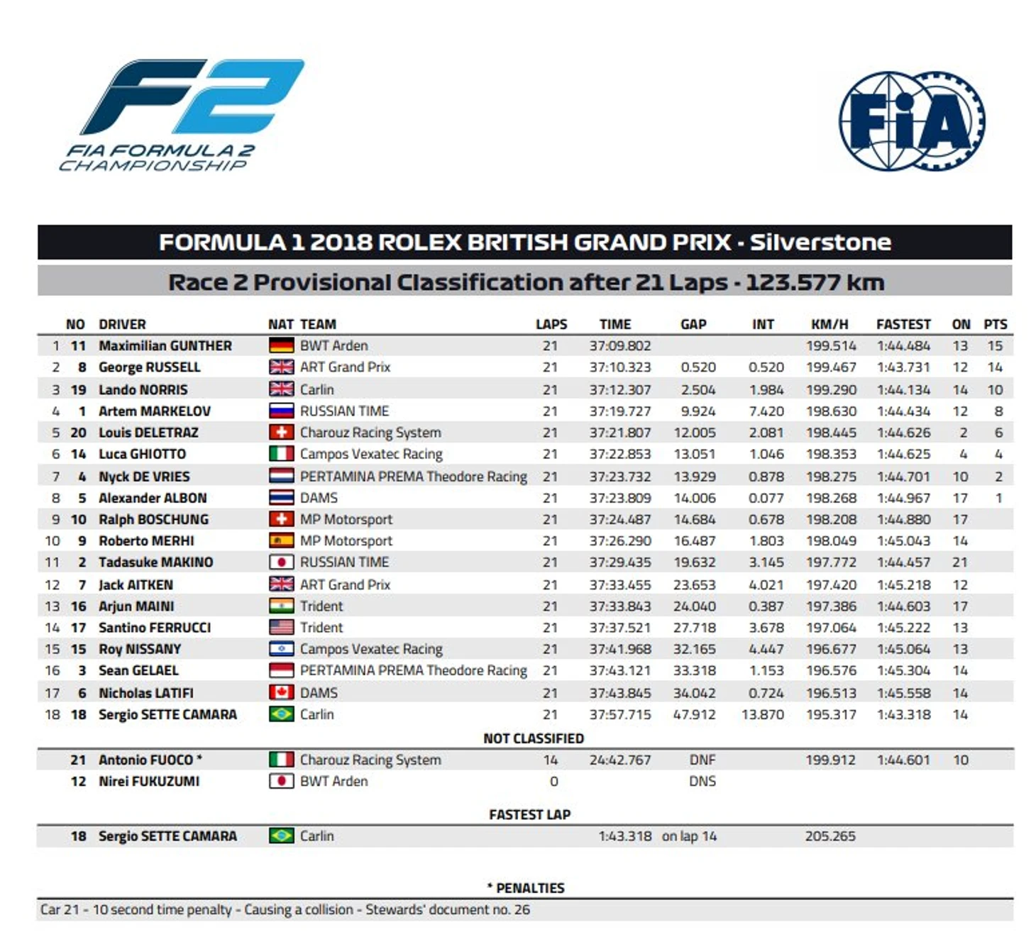 1. Максимилиан Гюнтер («Арден») – 21 круг2. Джордж Расселл («АРТ») +0,53. Ландо Норрис («Карлин») +2,54. Артем Маркелов («Русское время») +9,95. Луи Делетраз («Хароуз») +12,0