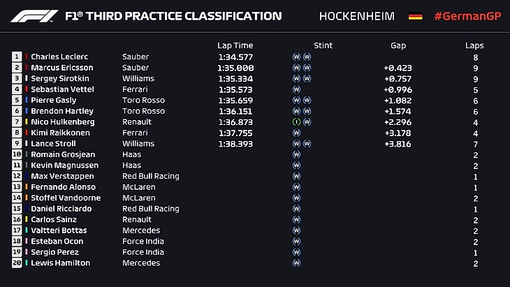 1. Шарль Леклер («Заубер») – 1.34,577 (8 кругов)2. Маркус Эрикссон («Заубер») +0,423 (9)3. Сергей Сироткин («Уильямс») +0,757 (9)4. Себастьян Феттель («Феррари») +0,996 (5)5. Пьер Гасли («Торо Россо») +1,082 (6)6. Брендон Хартли («Торо Россо») +1,574 (6)7. Нико Хюлькенберг («Рено») +2,296 (4)8. Кими Райкконен («Феррари») +3,178 (4)9. Ланс Стролл («Уильямс») +3,816 (7)10. Ромен Грожан («Хаас») – (2)11. Кевин Магнуссен («Хаас») – (2)12. Макс Ферстаппен («Ред Булл») - (1)13. Фернандо Алонсо («Макларен») - (1)14. Стоффель Вандорн («Макларен») - (2)15. Даниэль Риккардо («Ред Булл») - (1)16. Карлос Сайнс-младший («Рено») – (2)17. Валттери Боттас («Мерседес») - (2)18. Эстебан Окон («Форс-Индия») - (2)19. Серхио Перес («Форс-Индия») - (1)20. Льюис Хэмилтон («Мерседес») - (2)